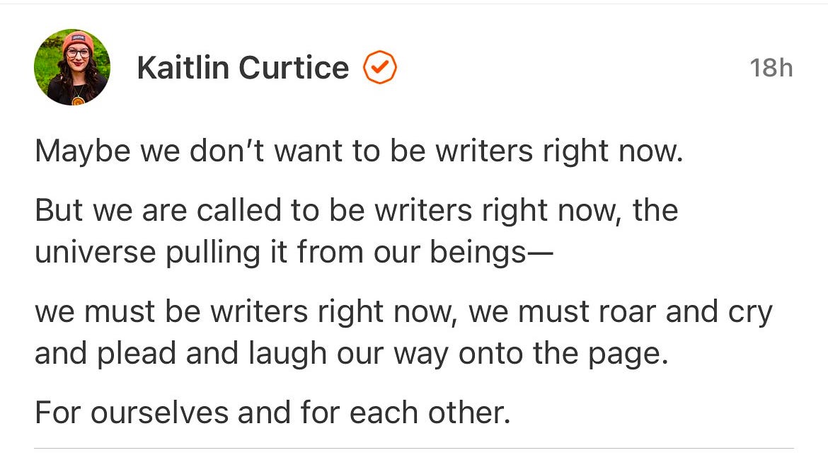 we must be writers right now, we must roar and cry and plead and laugh our way onto the page.